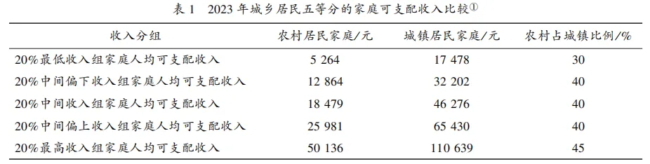 为什么农民收入快速增长,但是与城镇收入的绝对差距却在扩大?造成城乡收入绝对差距扩大的重要原因在于农村低收入群体的收入增速放缓。如果我们分析城乡居民不同收入组的差别(见表1),可以看出,低收入组的城乡居民可支配收入差距远高于高收入组。2023年,农村居民最高20%收入组的收入已经接近城镇居民最高20%收入组的50%,而最低20%收入组的农村居民收入不足城镇最低收入组的33.3%。表1的数据反映了城乡不同收入组的收入差别,可以看出,最低收入组的城乡收入差距最大。