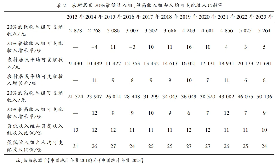 农村低收入人群的收入不仅低,而且增长缓慢,在“十四五”时期前三年,农村最低收入组的收入增速下降,与高收入组的差距在扩大。2013年到2023年的数据表明(见表2),在脱贫攻坚期间,农村低收入组的收入速度有了快速提升,但是到2021年以后,低收入组的收入增速放缓,2021—2023年,最低收入20%的农户可支配收入增长速度分别为4%、3%和5%,而高收入组的增长分别为12%、7%和9%。低收入组收入增长速度放缓造成低收入农户与高收入农户的差距不断扩大,2013年,低收入农户收入占高收入农户收入的13%,到2023年只占10%。