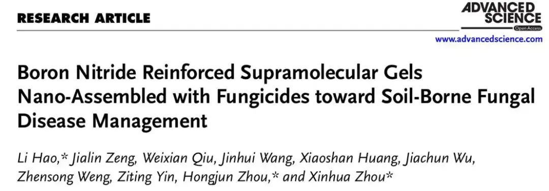 仲恺农业工程学院李浩教授团队2025年11月19日在《Advanced Science》(Q1,中科院1区Top,IF=14.1,DOI: 10.1002/advs.202515855)发表题目为“Boron nitride reinforced supramolecular gels nano-Assembled with fungicides toward soil-borne fungal disease management”的研究论文。