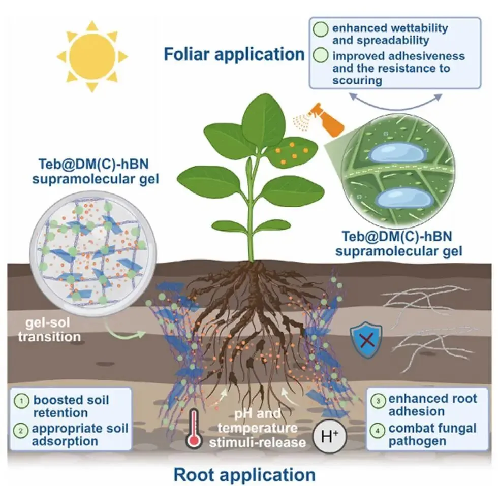 本研究成功开发了一种h-BN增强的超分子凝胶纳米组装系统(Teb@DM-hBN和Teb@DC-hBN),用于土传真菌病害的可持续管理。该系统通过协同整合超分子凝胶的微环境响应性和h-BN的粘附与结构特性,克服了传统杀菌剂的局限性。其创新之处在于将h-BN作为主动功能组分,实现了双重刺激响应释放、机械性能增强、界面粘附性提升、土壤持久性延长以及环境安全性改善。盆栽试验证实了其卓越的防效和促生长作用,为设计下一代智能、环保的农药输送系统提供了新思路。