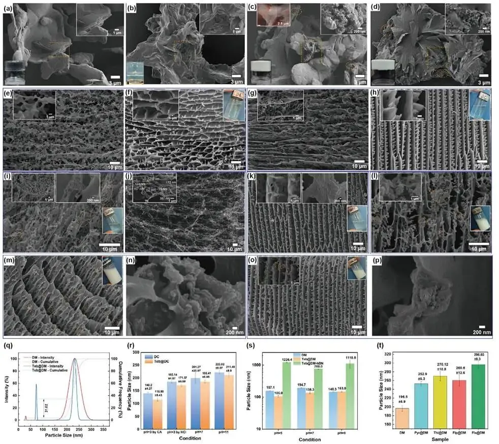 冷冻及溶胶态SEM图像显示,不同组分显著影响凝胶微观结构:Teb的加入使DM、DC凝胶层状结构更紧密有序,证实其起到桥接稳定作用;h-BN纳米片则以疏水作用嵌入纤维网络,作为物理交联剂增强交联密度、收窄孔径。粒径分析表明,Teb的疏水作用能引起组装体收缩,pH变化通过质子化/去质子化调节静电与氢键作用,进而影响尺寸,而h-BN的引入则因空间位阻大幅增加粒径。研究还证实该平台对吡虫啉、噻虫嗪等多种杀菌剂具有通用载药能力。