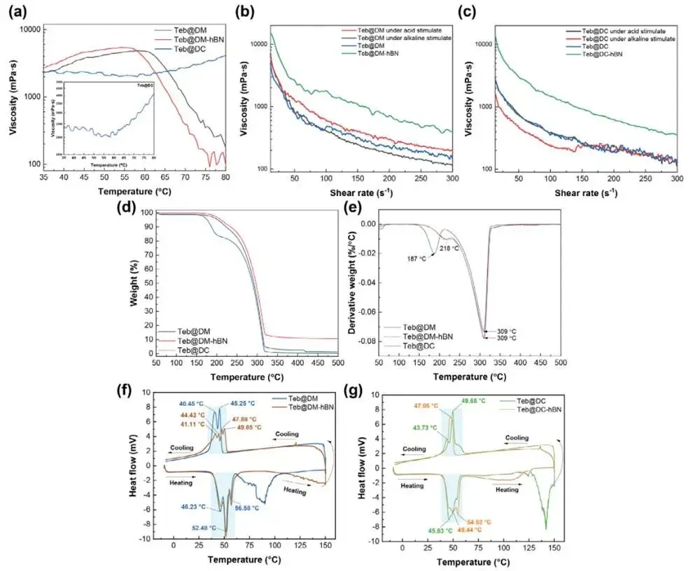 超分子凝胶表现出显著的温敏与pH响应特性。Teb@DM粘度在58℃达到峰值(4850 mPa·s),源于氢键与疏水作用的动态平衡;h-BN的加入可提前峰值温度并提升粘度至5400 mPa·s。Teb@DC则因CA的离子交联在35-58 ℃保持稳定,高温下因去质子化触发疏水重组,实现粘度恢复。两种凝胶均呈现剪切稀化行为,利于喷雾应用。pH通过调控基团质子化/去质子化影响粘度:Teb@DM在酸性下粘度升高,碱性下降低;Teb@DC变化较小。h-BN的引入使零剪切粘度提升3-5倍,并在高剪切下保持较高强度,显著增强了凝胶的机械稳定性和网络完整性。热重分析表明,Teb的加入使DM与DC凝胶的碳链分解温度偏移至309℃,提升了热稳定性;h-BN的引入则进一步增强了相变过程的动力学稳定性。DSC分析证实了凝胶具有可逆的热循环特性:Teb@DM呈现三重吸热峰,而DC体系峰形更单一,Teb的加入引入了轻微异质性。