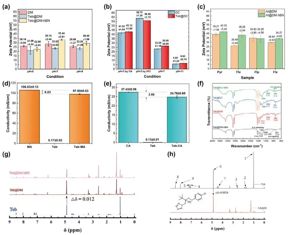 通过zeta电位、电导率、FTIR、核磁、XRD及XPS等综合表征,系统揭示了各组分间的复杂相互作用:Teb通过π-π堆积、氢键(尤其与MA/CA中羧基作用,使其三唑环N质子化)及疏水作用嵌入凝胶网络和h-BN层间,并有效调控局部电荷环境;h-BN则通过静电与介电效应显著提升体系zeta电位。这些作用协同增强了结构的稳定性与响应特性。