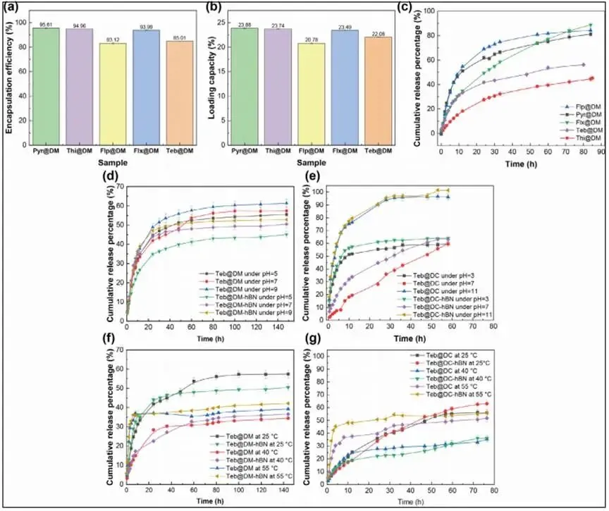 图4 不同杀菌剂在DM凝胶中的包封率/负载量及释放曲线,以及Teb在DM/DC体系及其h-BN增强体系中受pH、温度调控的响应性释放行为