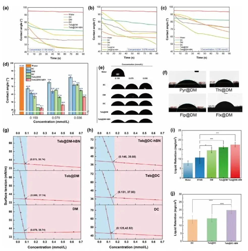 图5 不同超分子体系(含Teb、h-BN等)在黄瓜叶片上的动态接触角、表面张力及液体保持能力测试,并与水和常规制剂(SC/STAB)对照比较