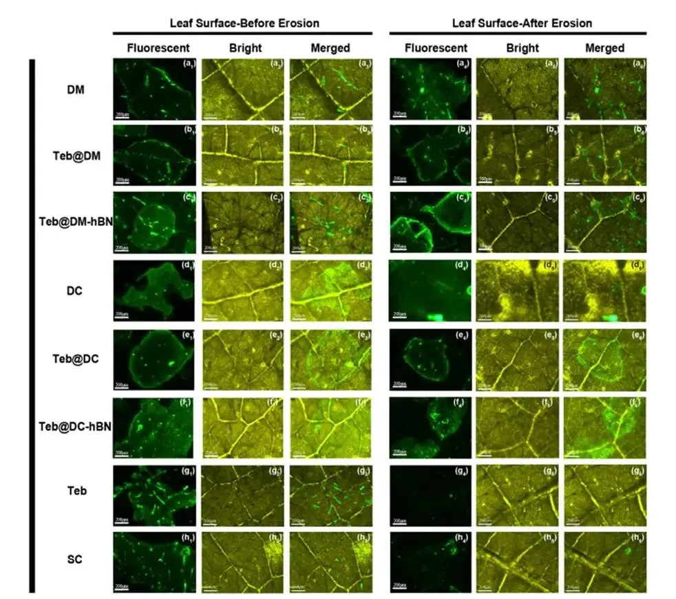荧光显微镜观察表明,经模拟降雨冲刷后,游离Teb及市售SC制剂的荧光信号几乎或大量消失,而超分子凝胶(DM/DC及其含Teb、h-BN的复合物)在叶片表面仍保持高强度荧光。这证实了凝胶体系通过氢键、静电作用及h-BN的强亲和力,显著增强了在疏水叶片上的粘附性与抗雨蚀性能,有效减少了农药流失。