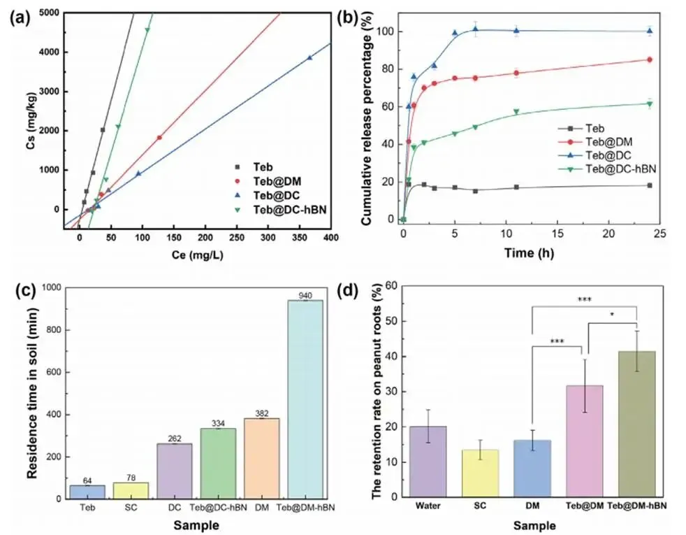 土壤吸附与解吸研究表明,游离Teb吸附最强但解吸最慢,而超分子载体改变了其土壤行为:DC载体倾向于快速释放(解吸快),DM载体支持缓释,h-BN的引入则通过增强与土壤的界面作用,显著提升了复合载体(如Teb@DC-hBN)的吸附与滞留能力。土壤柱淋洗实验证实,h-BN增强的超分子凝胶在土壤中滞留时间最长(可达940 min),远优于游离Teb和常规制剂。花生根浸渍试验进一步表明,Teb@DM-hBN在根部的粘附滞留率最高(41.45%)。这些结果证明,通过选择载体类型和引入h-BN,可精准调控农药在土壤中的吸附、释放与滞留性能,从而实现长效保护并降低淋溶风险。