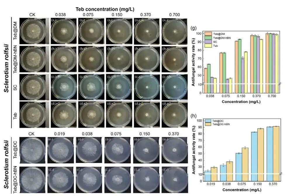 研究表明,Teb@DM与Teb@DC超分子体系的抗真菌活性显著优于游离Teb及市售悬浮剂(SC),其EC50值更低。随时间推移,凝胶体系因缓释特性保持更高的抑制率(如第6天Teb@DM-hBN达80.27%),证实其延长了药效。这种增强源于双重机制:一是DM/DC载体本身具有阳离子表面活性剂样结构,能破坏真菌细胞膜;二是其纳米尺寸与可控释放特性提升了Teb的生物利用度与作用持续性。h-BN的引入进一步优化了释放动力学,协同增强了防治效果,实现了在更低浓度下的高效抑菌。
