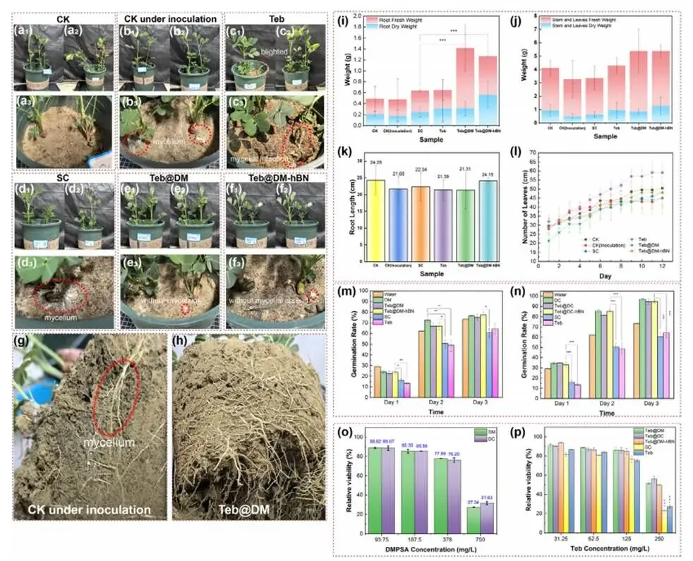 图9 不同处理(含CK、Teb、SC、Teb@DM、Teb@DM-hBN等)下花生盆栽的抗病效果、植株/根系生长指标、种子发芽率及对NIH3T3细胞的毒性对比