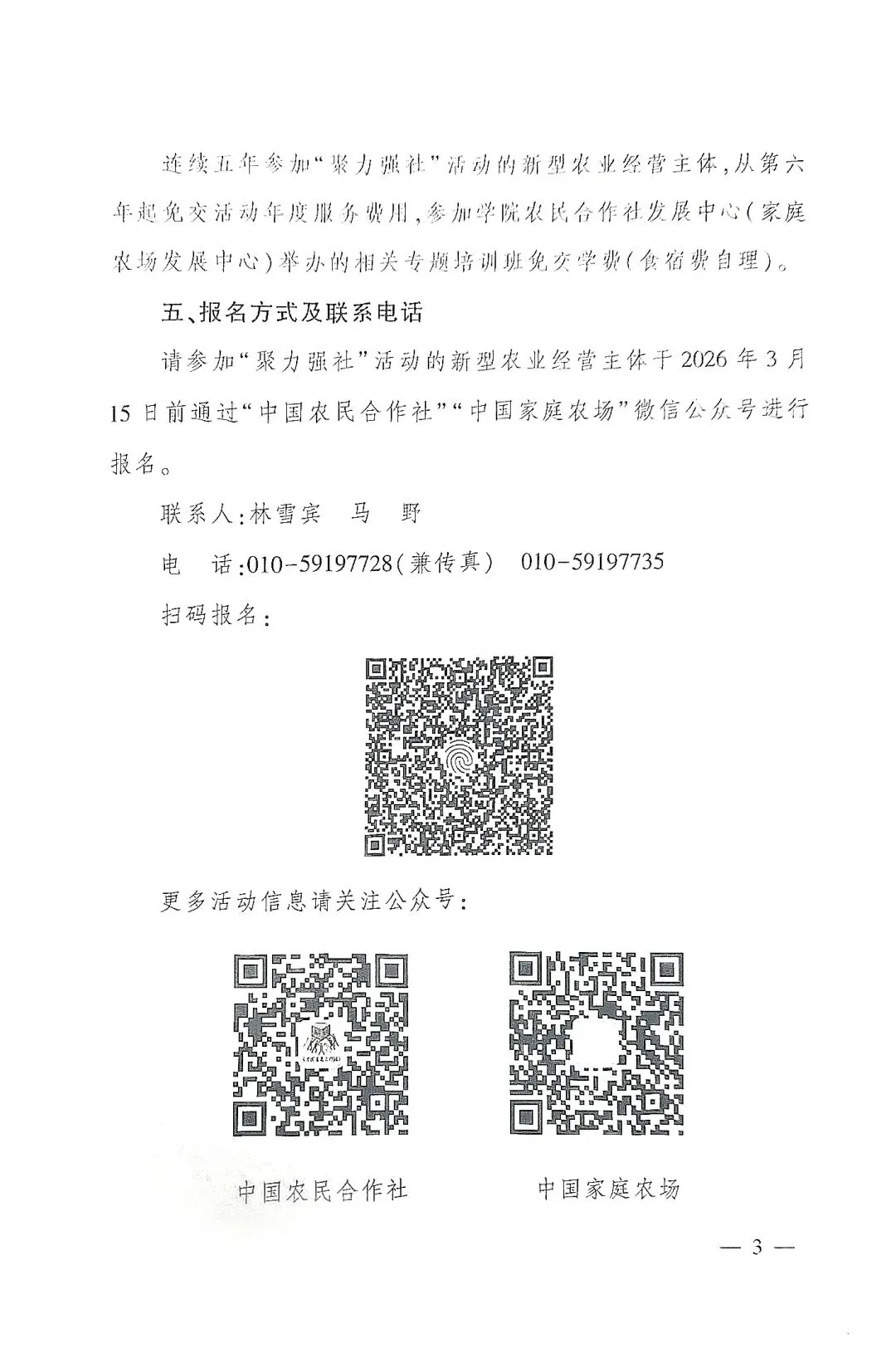 请参加“聚力强社”活动的新型农业经营主体于2026年3月15日前通过“中国农民合作社”“中国家庭农场”微信公众号进行报名。