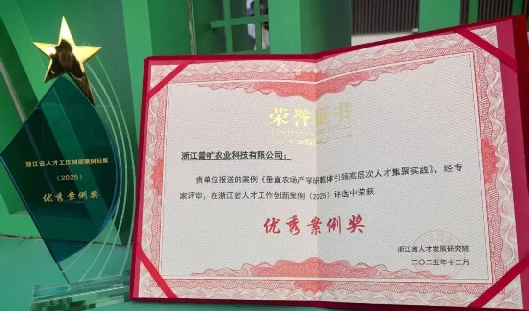 近日,浙江普旷农业科技有限公司(简称普旷农业)报送的案例《垂直农场产学研载体引领高层次人才集聚实践》,经浙江省人才发展研究院专家评审,在浙江省人才工作创新案例(2025)评选中荣获优秀案例奖!