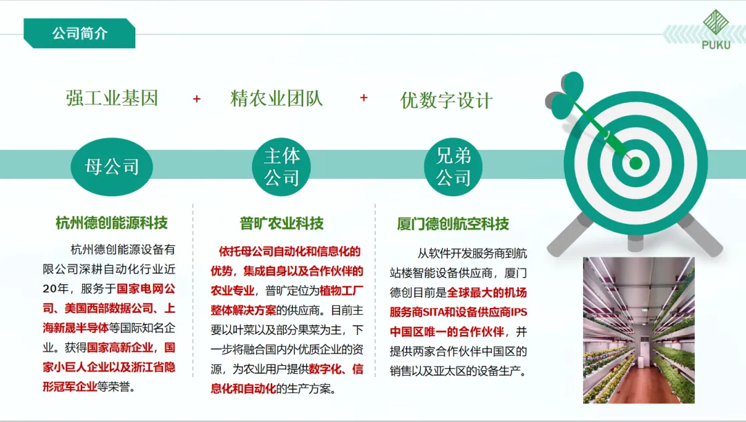 浙江普旷农业科技有限公司成立于2022年,坐落于杭州市余杭区,是一家致力于农业科技创新的新兴企业,涉足智慧农业领域,深入种植技术研发、自动化设备创新等方向,为客户提供依托数智植物工厂技术的综合农业解决方案。