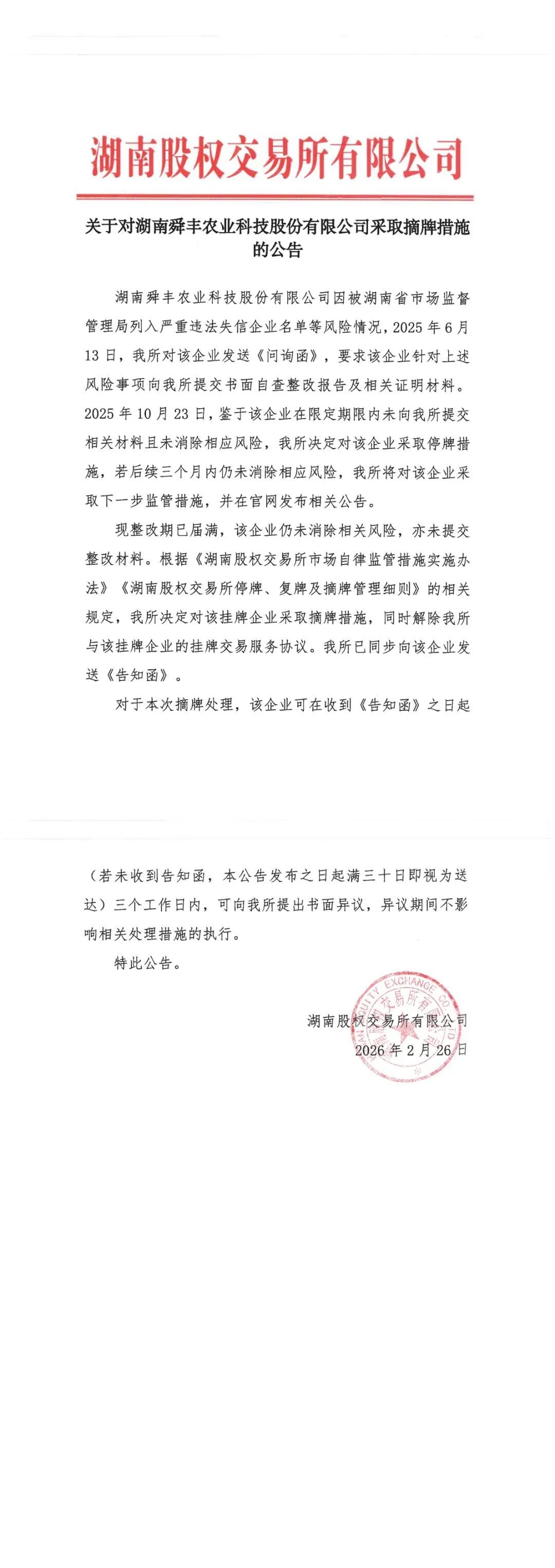 通知公告丨关于对湖南舜丰农业科技有限公司采取摘牌措施的公告