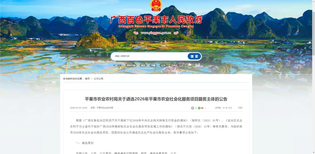 根据《广西壮族自治区财政厅关于提前下达2026年中央农业相关转移支付资金的通知》(桂财农〔2025〕81号)、《自治区农业农村厅办公室关于做好广西2026年提前批农业社会化服务项目实施工作的通知》(桂农厅办发〔2026〕15号)等有关要求,为做好我市2026年农业社会化服务项目,现面向社会公开遴选农业生产社会化服务主体。有关事项公告如下: