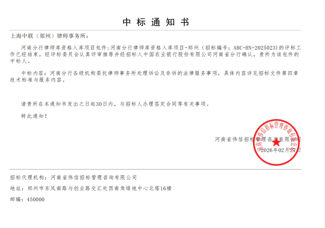 近日,中联律师事务所郑州办公室中标中国农业银行河南省分行律师库资格入库项目。