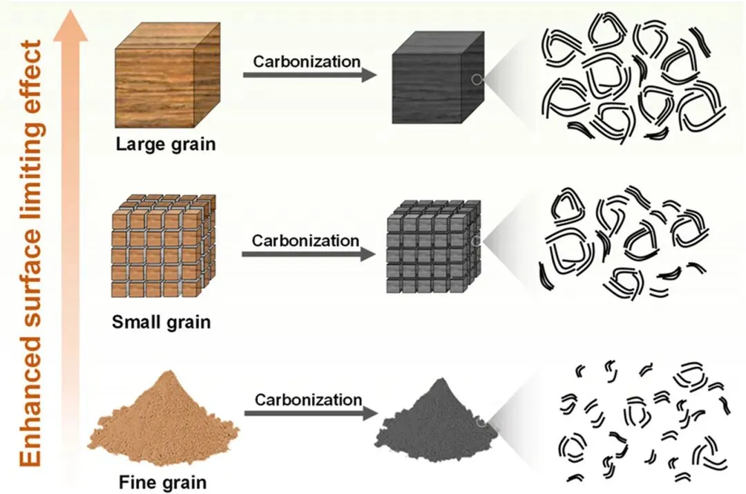 该研究系统阐明了前驱体表面限域效应对硬碳闭孔形成的关键作用,提出了一种通过调控前驱体表面特性来工程化构建闭孔的新策略。研究表明,前驱体的表面限域效应强度是决定硬碳最终孔结构的临界因素:大颗粒、密堆积的荔枝木前驱体(L-LW)具有更强的表面限域效应,通过降低反应动力学抑制早期表面碳化,为挥发分逸出和碳层弯曲折叠重组提供了充足时间和空间自由度,有利于形成丰富的内部闭孔和更大的石墨微晶;相反,小颗粒前驱体的表面限域效应较弱,导致快速表面碳化、早期孔闭合和短程石墨域的发展。受益于高闭孔含量,源自大颗粒荔枝木的硬碳(C-L-LW)表现出高可逆/平台容量、优异倍率性能和出色长期循环稳定性。综合电化学和结构分析证实,所设计的结构通过层间嵌入和孔填充提供了额外的钠存储位点。这些发现不仅建立了前驱体微观结构与硬碳闭孔演化之间的直接构效关系,也为通过精确调控前驱体结构有序度和堆积密度开发高性能硬碳负极提供了通用的材料设计指导原则。该策略具有原料来源广泛、制备工艺简便、可规模化生产等优势,对推动钠离子电池硬碳负极材料的实用化进程具有重要意义,未来研究将进一步评估该策略在不同前驱体中的普适性以及加工参数对宏观电极性能的影响。