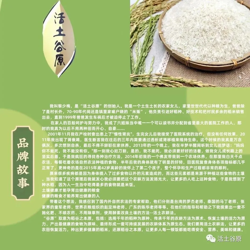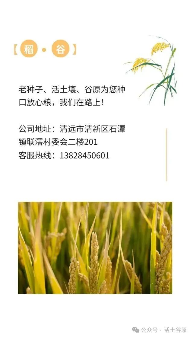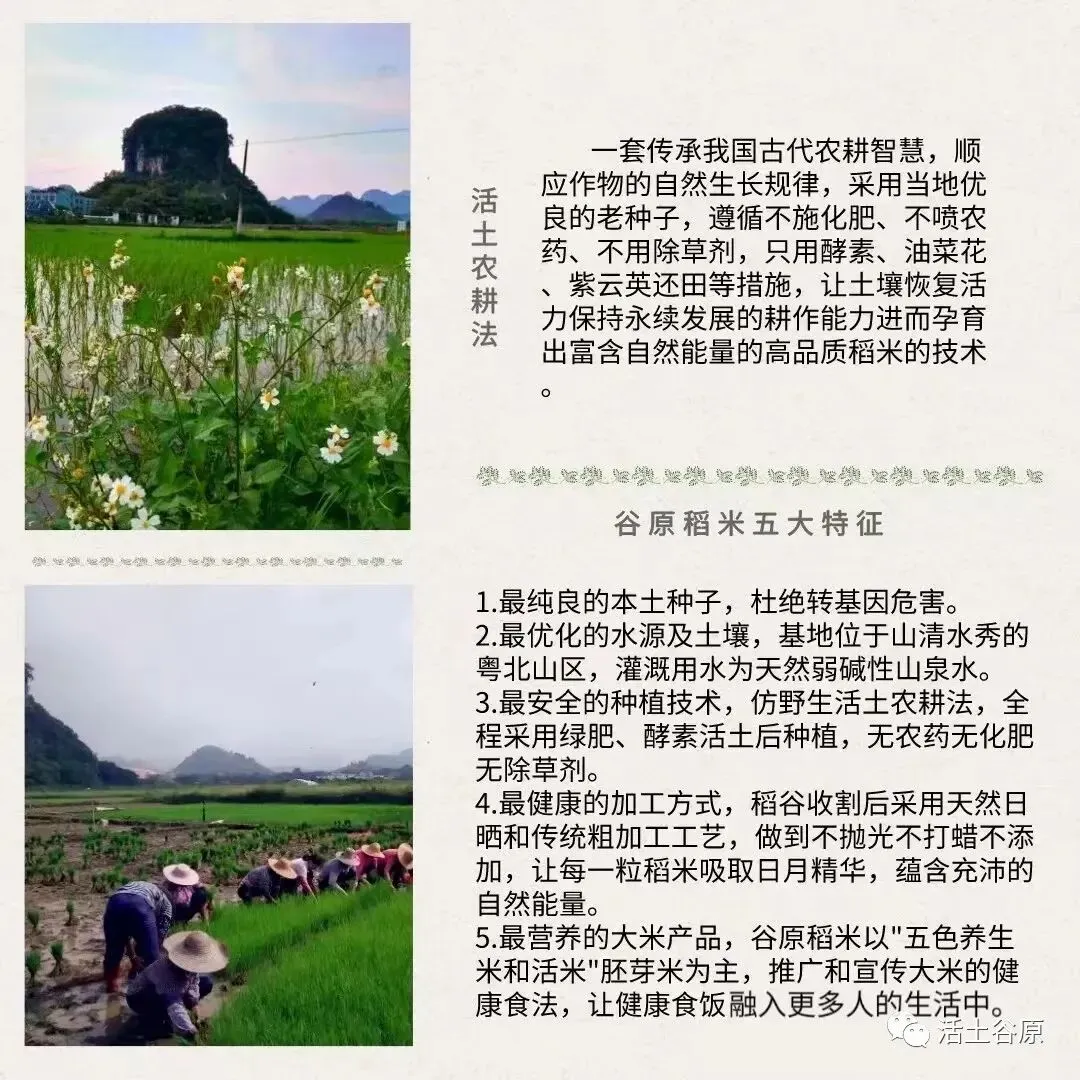 清远市谷原生态农业有限公司,简称谷原,取意为种植稻谷之本原,包括:选用千年的稻种为原种、传承千年的农耕方法为原术、恢复土壤的活力为原力、产出最健康的食物为原味、最终形成一套可持续发展的农耕体系为原生态。注册有农业公司和合作社实体,是一家运用医学理念从种子、土壤等源头解决稻米安全的实体企业。公司经国家知识产权局注册有“活土谷原”商标。公司以种植过程不施化肥、不喷农药、不用除草剂,使用绿肥和酵素活化土壤的活土农耕法为标杆,匠心种植出高品质稻米为使命。目前公司的消费群体主要为医学界会员为主。未来公司以“公司(合作社)+农户”的模式带动更多农户种植出更多优质稻米,与更多客户共建美好环境、共享健康生活。