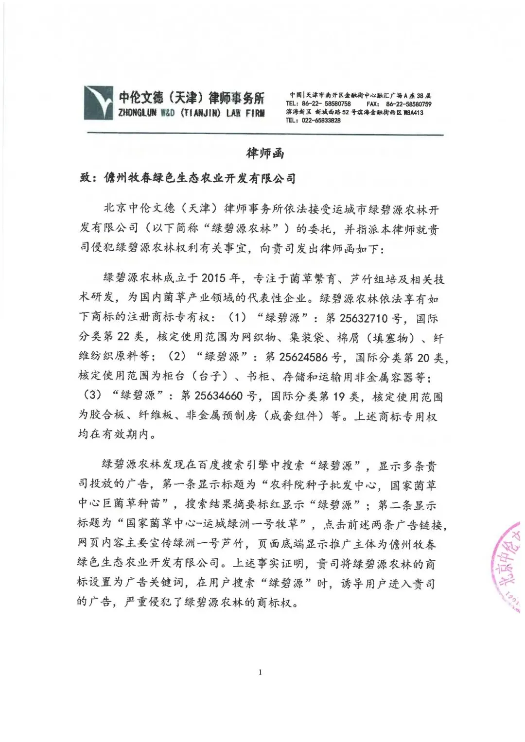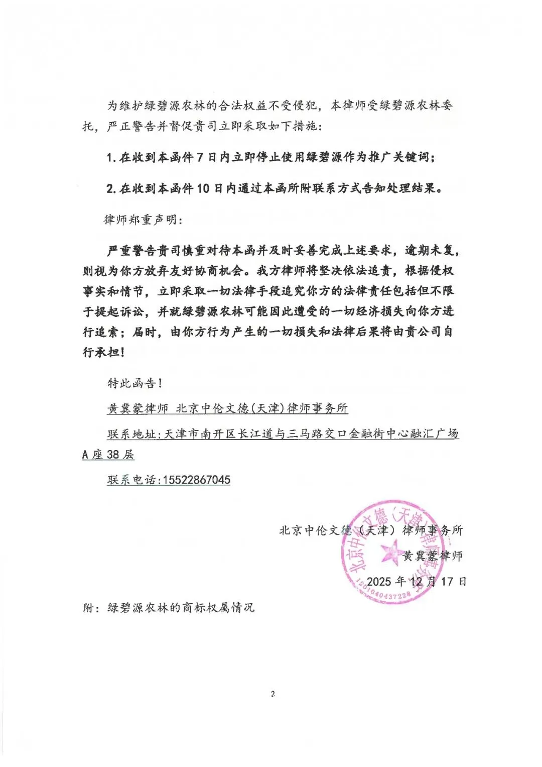 事由:关于立即停止侵犯“绿碧源”注册商标专用权及不正当竞争行为的告知函