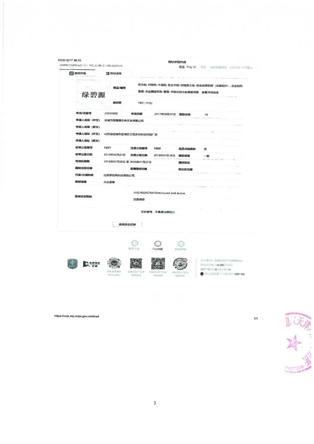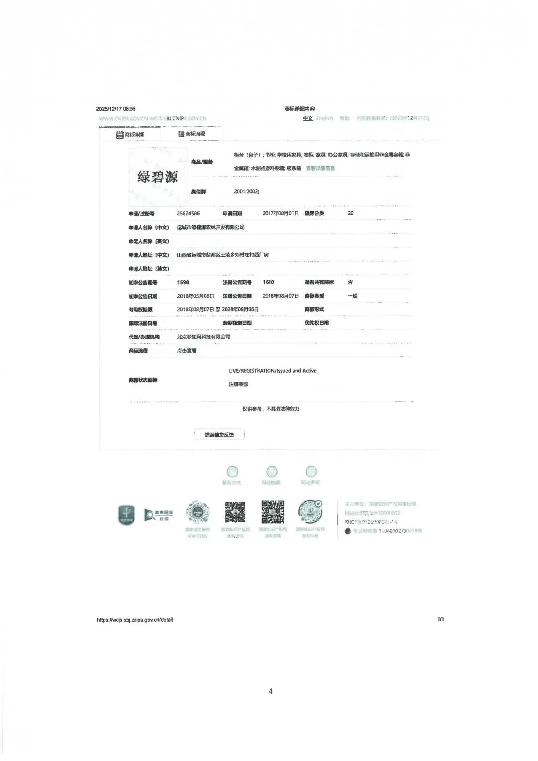 运城市绿碧源农林开发有限公司(以下简称“我司”)成立于2015年6月17日,系“绿碧源”系列注册商标的合法权利人。我司依法注册并享有第25632710号(第22类)、第25624586号(第20类)、第25634660号(第19类)“绿碧源”商标专用权,上述商标均在有效期内,受法律保护。我司同时也是“绿州一号”芦竹组培技术的合法授权实施主体,在行业内具有广泛的市场知名度和良好商誉。