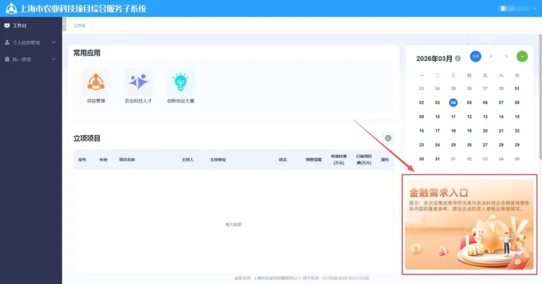 请登录上海市农业科技项目综合服务子系统(https://nykj.nyncw.sh.gov.cn)个人账户,点击工作台右侧“金融需求入口”进行填报。