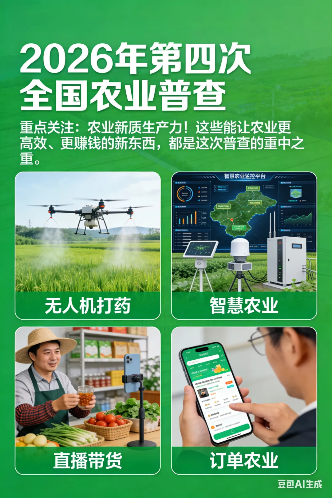 重点关注:农业新质生产力!——比如有没有用无人机打药、搞智慧农业,有没有尝试直播带货、订单农业等新经营模式,这些能让农业更高效、更赚钱的新东西,都是这次普查的重中之重。