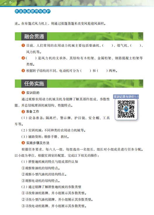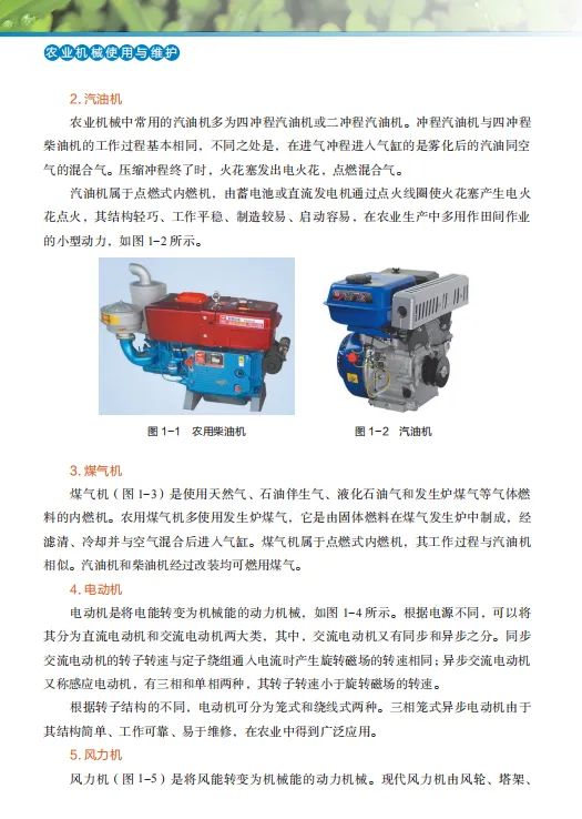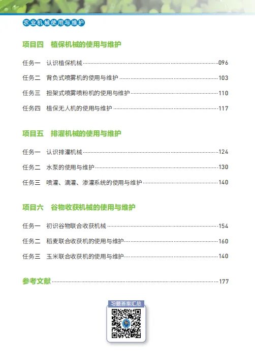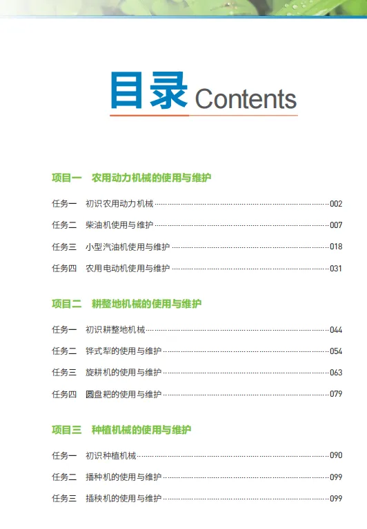 本教材以项目式教学为核心,以情景任务为驱动,内容涵盖机械结构原理、安全操作规范、日常维护保养、故障诊断排除等多维度技术要点。通过“播种机维护保养”“如何正确使用水泵”等20余个典型生产场景设计,结合案例分析、模拟操作与虚拟实训,助力学习者实现理论知识向实践能力的转化,培养复杂农机问题的综合解决能力。