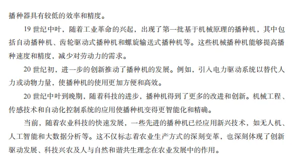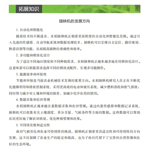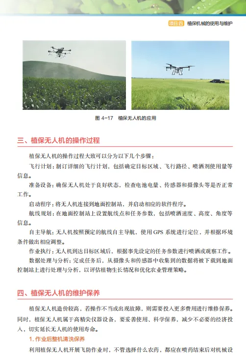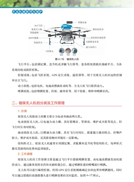教材内容紧跟现代农业技术发展步伐,与时俱进,紧跟科技发展趋势,介绍了最新的农用机械技术和成果,融入了植保无人机等前沿技术应用,对新技术进行深度解析,促进了农业机械化智能化的发展,突出了教材的“科学性、先进性、前瞻性、实用性”。