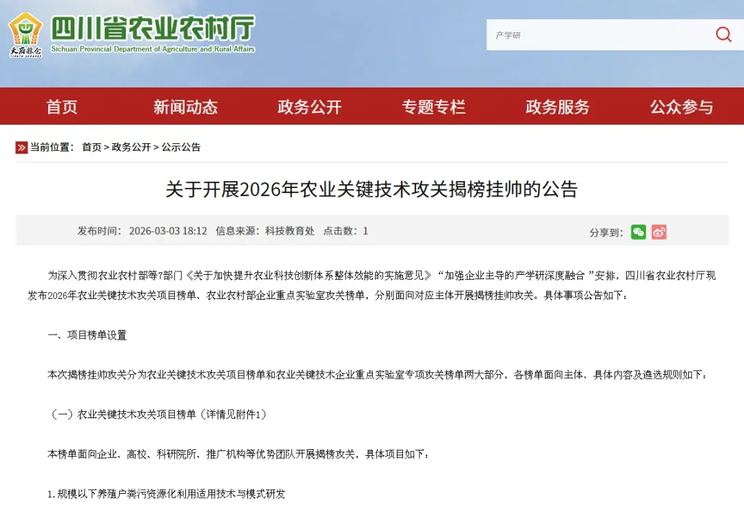 今年的省委一号文件《关于加快推进乡村全面振兴 开创农业农村现代化建设新局面的意见》也明确部署,2026年四川将进一步提升农业科技创新水平,“统筹整合高校、科研院所、涉农企业等资源力量,联合开展农业基础科学研究和关键核心技术攻关。”而此次开展的农业关键技术攻关揭榜挂帅,便是其中落地推进的具体举措。
