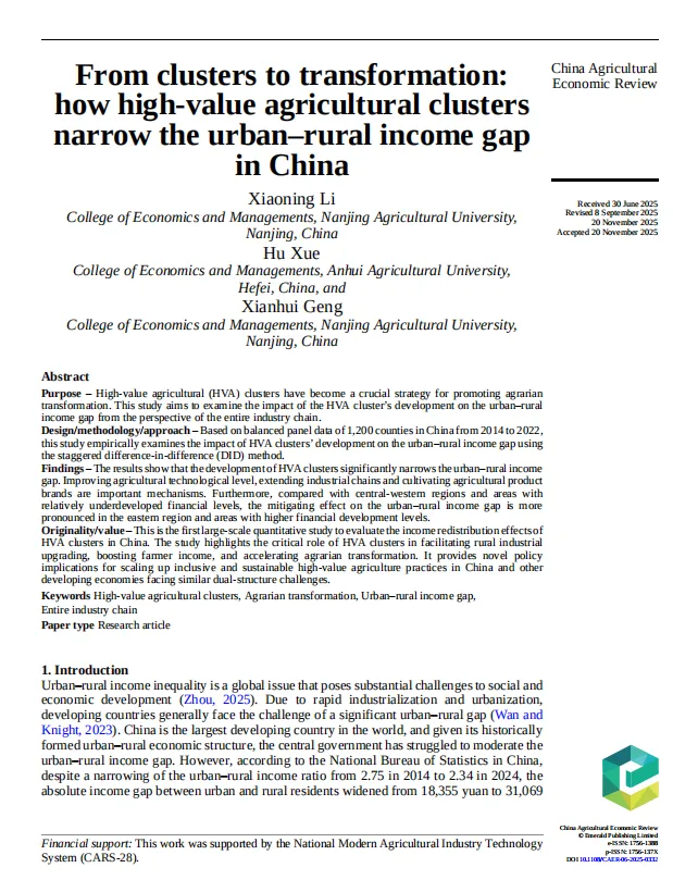 近日,由南京农业大学经济管理学院博士研究生李小宁、安徽农业大学经济管理学院讲师薛虎和南京农业大学经济管理学院耿献辉教授(通讯作者)合作撰写的论文《From clusters to transformation:how high-value agricultural clusters narrow the urban–rural income gap in China》(《从集群到转型:高附加值农业集群如何缩小中国城乡收入差距》)在SSCI期刊《China Agricultural Economic Review》上发表。