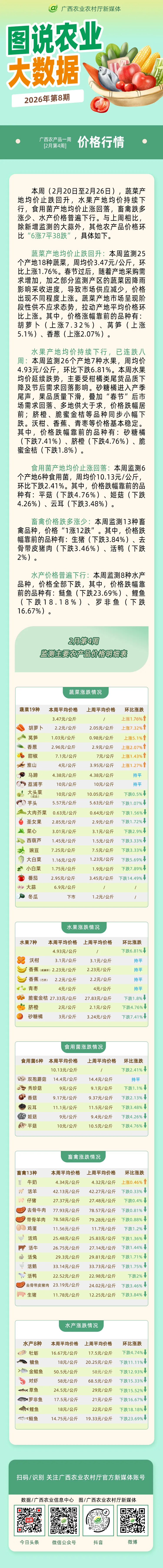 本周(2月20日至2月26日),蔬菜产地均价止跌回升,水果产地均价持续下行,食用菌产地均价止涨回落,畜禽跌多涨少、水产价格普遍下行;与上周相比,除新增监测的大蒜以外,其他农产品价格环比“6涨7平38跌”,具体如下:
