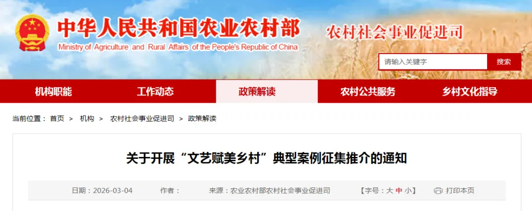 为深入贯彻习近平文化思想和习近平总书记关于“三农”工作的重要论述,按照《“文艺赋美乡村”工作方案(2025—2027年)》部署安排,鼓励支持文艺工作者深入农村、贴近农民开展文化结对帮扶,持续参与乡村文化建设,农业农村部、中央宣传部、教育部、文化和旅游部、广电总局、中国文联、中国作协决定联合开展“文艺赋美乡村”典型案例征集推介。现将有关事项通知如下。
