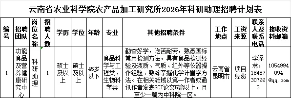1.云南省农业科学院农产品加工研究所2026年科研助理招聘计划表