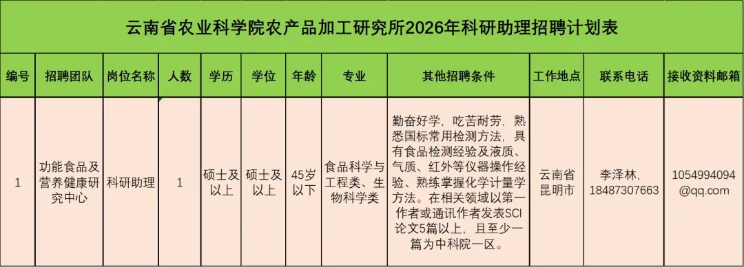 1.云南省农业科学院农产品加工研究所2026年科研助理招聘计划表