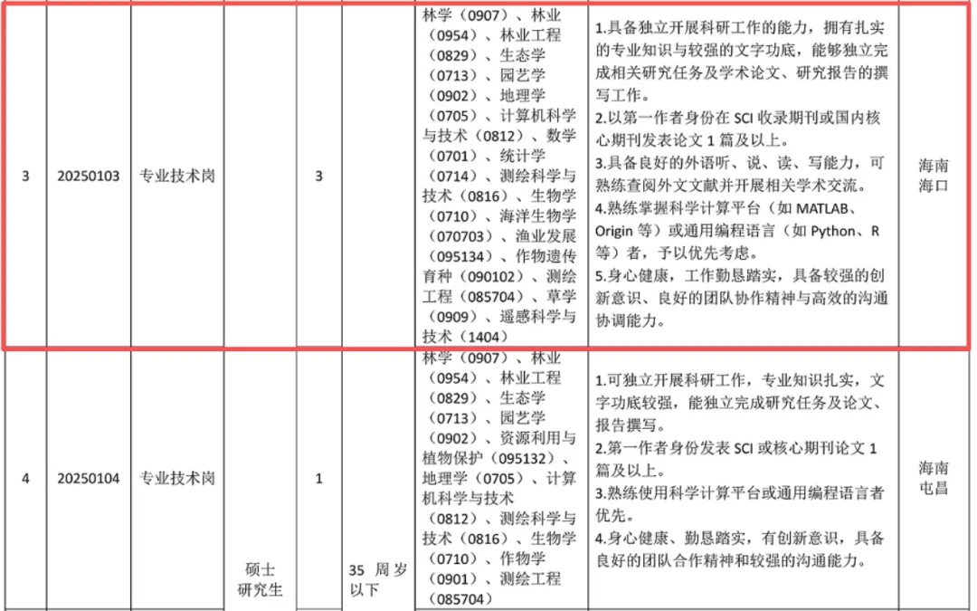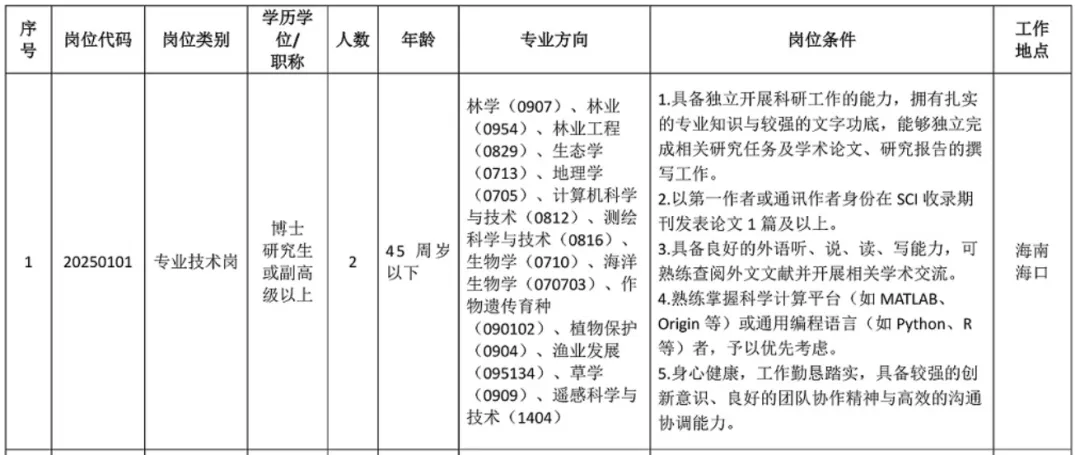 海南省林业科学研究院(海南省红树林研究院)成立于1958年,隶属海南省林业局,为正处级林业科研单位;内设15个部门、2个下属单位,在职职工185人。主要从事红树林生态修复、热带林木种质资源保育、森林资源与生态环境监测、智慧林业、林业碳汇、森林生物多样性保护等基础和应用研究,以及林业调查规划设计等技术服务工作,为国家生态文明试验区、海南热带雨林国家公园建设提供林业科技支撑。建有国家林草种质资源设施保存库海南分库、海南文昌森林生态系统定位观测研究站、院士工作站等13个省部级以上科研平台,科研示范基地2000余亩。根据上级行政主管部门批复意见,为适应我院科研事业发展需要,优化人才招聘条件、拓宽引才范围、提升人岗匹配度。现结合 2025 年度招聘报名情况,对 2026 年度专业技术岗位相关条件进行优化调整。海南省林业科学研究院(海南省红树林研究院)2026 年度公开招聘工作人员共设置 6 个岗位,计划招聘 9 人。本次招聘岗位延续2025年度公开招聘工作人员公告(第十一号)相关安排,已报名且符合原资格条件的人员,视同已报考本次公开招聘岗位,原报名资格继续有效。7.应聘时已与我省党政机关(含派出机构)、事业单位建立人事关系的人员应征得原所在单位同意方可报考,按照人事管理权限,必要时应征得单位主管部门同意。8.年龄在18周岁以上、35周岁以下,即1990年4月1日至2008年3月31日期间出生;18周岁以上、45周岁以下,即1980年4月1日至2008年3月31日期间出生。1.尚未解除党纪、政纪处分或正在接受纪律审查、监察调查的;2.刑事处罚期限未满或涉嫌违法犯罪正在接受调查的;3.在公务员招录、事业单位公开招聘中违纪违规且处理期限未满的;4.公务员或事业单位工作人员处于试用期内或未满最低服务年限的;6.拒绝、逃避征集服现役且拒不改正的应征公民;以逃避服兵役为目的,拒绝履行职责或者逃离部队且被军队除名、开除军籍或者被依法追究刑事责任的军人;本招聘公告在省林业局、省林科院官网及公众号向社会公开发布。后续招聘工作的有关事项,在省林科院官网及公众号发布公告。采取网上报名方式进行,报名网址:http://ngukaoshi.com/#/login?itemId=2o2jYewNQFb。包括填写报名信息、上传照片和证明材料等、查询资格审查结果、打印准考证等环节。报考人员只限报一个招考岗位。报考后应及时登录省林科院官网了解招聘工作进展情况和有关事项的公告,并保持报名时登记的联系方式畅通。本次考试实行诚信报名制度,报考人员要按要求真实、全面、准确填写《海南省林业科学研究院(海南省红树林研究院)公开招聘人员报名表》(附件1),签署《考生诚信承诺书》(附件2),信息填报不实或虚假的,一经查实,视情节轻重,取消考试资格或录用资格,并按有关规定给予处理。2026年3月2日8:30至2026年3月20日17:30。(1)《海南省林业科学研究院(海南省红树林研究院)公开招聘人员报名表》(附件1,本人签名并扫描上传);(2)本人有效居民身份证(正反面在同一页面)复印件,户口本(户主与本人页)复印件;(3)与应聘岗位相匹配的学历学位证书。取得国外或境外学历学位的,还须上传教育部留学服务中心出具的相关认证证书等。2026年应届毕业生未取得毕业证、学位证的,须提供所在学校相关证明;国(境)外留学回来的应聘人员、国内应聘人员所学专业名称与岗位需求表中专业不完全一致的,须提供所学课程,并由我院招聘领导小组研究确定是否符合专业报考资格。(4)中国高等教育学生信息网(http://www.chsi.com.cn/ )下载打印有二维码标识的《教育部学历证书电子注册备案表》,2026年应届毕业生尚未到毕业时间的,需上传有二维码标识的《教育部学籍在线验证报告》;(6)报考时已与我省党政机关(含派出机构)、事业单位建立人事关系的人员,须按照人事管理权限,上传所在单位或主管部门加盖公章的同意报考证明(附件3);(7)《考生诚信承诺书》(本人签名并扫描上传,见附件2);根据招聘条件及岗位要求,对报名人员的基本信息、所提供的材料等进行资格初审。网上报名系统在已过报名期限后不再接受考生新注册报名。已经提交报名材料的考生,须在规定时间内及时登录报名系统查询资格审查结果。资格审查通过的,不得改报或再报其他职位。资格审查未通过的请及时补充材料重新提交或改报。本次岗位招聘系统于2026年3月2日8:30开通报名;将于2026年3月20日17:30准时关闭报名注册通道,并于2026年3月21日17:30关闭材料提交通道。如果在规定时间内未重新提交或资格审查仍未通过的,视为自动放弃考试资格,不能参加考试。系统将于规定时间内准时关闭。报考人员只限报一个招考岗位,按岗位的招聘数与应聘该岗位符合报考条件人数的比例原则上不低于1:3方可进行笔试,达不到该比例的,相应递减该岗位招聘人数直至取消该岗位的招聘。资格审查贯穿于公开招聘全过程,对弄虚作假等违反招聘规定的,一经发现,一律取消应聘或聘用资格。报考人员通过资格审查的,请登录报名系统打印报名资格审查表和准考证,打印时间:(时间另行通知),请考生留意省林科院官网。招聘岗位(岗位代码:20250101),其他岗位报名人员中专业方向具有博士研究生学历或副高级及以上专业技术职称的,年龄可放宽至45 周岁以下。该类人员采取直接面试考核方式进行,不受岗位资格审查通过