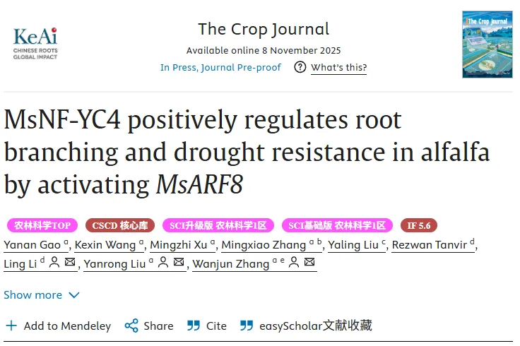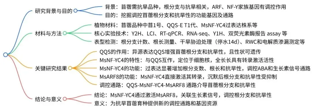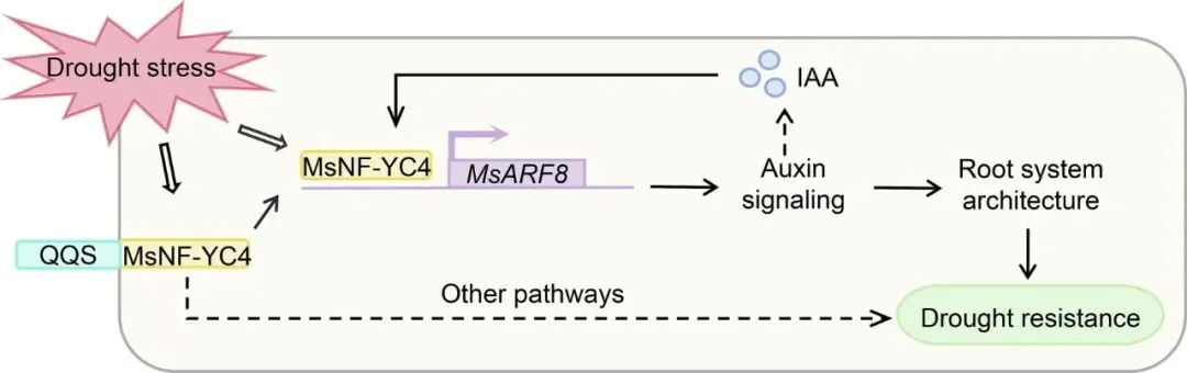本研究的核心创新之处在于,系统性地阐明了一条在重要牧草紫花苜蓿中,由外源基因QQS介导,通过内源互作蛋白MsNF-YC4及其下游靶基因MsARF8,最终调控根系发育和抗旱性的完整分子通路(QQS → MsNF-YC4 → MsARF8 → 生长素信号 → 根系分枝与抗旱性)。这不仅揭示了QQS在紫花苜蓿中发挥作用的具体机制,也为通过基因工程改良作物农艺性状提供了新的理论依据和靶点。