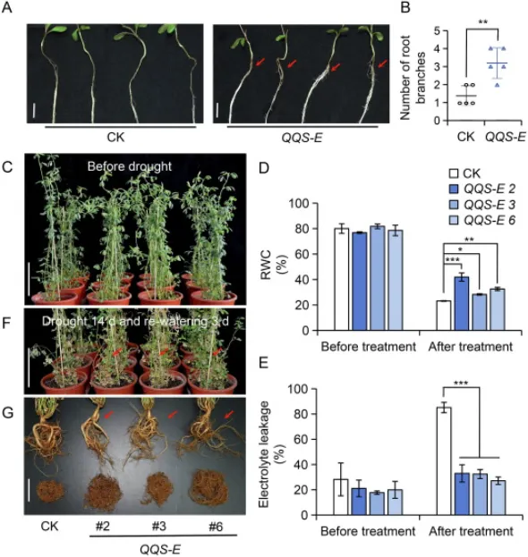 图1. QQS增强紫花苜蓿的根系分枝和抗旱性。(A, B) 两周龄CK(非转基因)和QQS-E(转基因)幼苗的根系分枝表型及其根分枝数统计分析(n=5)。实验使用QQS-E株系2。红色箭头指示根分枝位置。标尺=1 cm。,P < 0.01(学生t检验)。(C, F) 3月龄CK和QQS-E幼苗在干旱胁迫前以及经历14天干旱胁迫并复水3天后的表型。红色箭头指示恢复良好的分枝位置。标尺=10 cm。(D, E) 干旱胁迫下测试植株叶片的相对含水量(RWC)和电解质渗漏率(n=3)。*,P < 0.05;,P < 0.01;***,P < 0.001(单因素方差分析)。误差棒代表平均值±标准差(SD)。(G) 复水后QQS-E和CK植株的根系表型。红色箭头指示根分枝位置。标尺=5 cm。