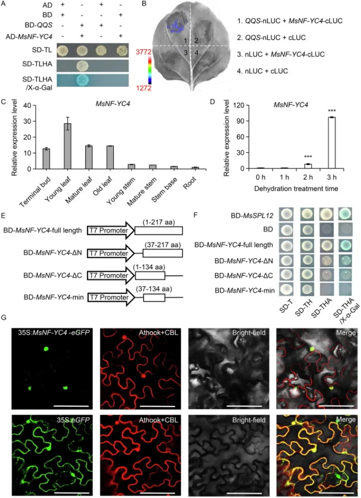 图2. QQS与核定位转录因子MsNF-YC4互作。(A) 酵母双杂交(Y2H)分析显示QQS与MsNF-YC4之间的相互作用。SD-TL:SD/-Trp-Leu培养基;SD-THLA:SD/-Trp-Leu-His-Ade培养基;SD-THLA/X-α-Gal:添加了X-α-Gal的SD-THLA培养基。(B) QQS与MsNF-YC4的体内相互作用。(C) MsNF-YC4在紫花苜蓿不同组织中的表达模式。(D) 脱水处理下紫花苜蓿根部MsNF-YC4的表达模式。***,P < 0.001(单因素方差分析)。数值为平均值±标准差。(E, F) 全长(BD-MsNF-YC4-full length)及截短体(BD-MsNF-YC4-ΔN, BD-MsNF-YC4-ΔC, 和 BD-MsNF-YC4-min)MsNF-YC4编码序列在酵母系统中的转录激活分析。SD-T:SD/−Trp;SD-TH:SD/−Trp-His;SD-THA:SD/−Trp-His-Ade;SD-THA/X-α-Gal:添加了X-α-Gal的SD-THA培养基。(G) MsNF-YC4在烟草叶细胞中的亚细胞定位。Athook:核定位标记蛋白;CBL:质膜定位标记蛋白。标尺=100 µm。