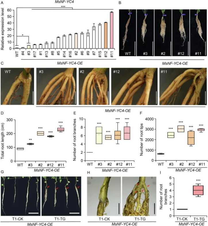 图3. MsNF-YC4调控紫花苜蓿的根系发育。(A) MsNF-YC4-OE植株中MsNF-YC4的相对转录水平(n=3)。,P < 0.05;,P < 0.001(单因素方差分析)。(B, C) 由扦插繁殖的3月龄MsNF-YC4-OE和WT植株的根系结构。标尺分别为10 cm (B) 和 5 mm (C)。(D) MsNF-YC4-OE和WT植株的总根长(n=5)。,P < 0.01;,P < 0.001(学生t检验)。数值为平均值±标准差。(E) MsNF-YC4-OE和WT植株根分枝数的统计分析(n=6)。,P < 0.001(单因素方差分析)。数值为平均值±标准差。(F) MsNF-YC4-OE和WT植株的总根尖数。星号表示经单因素方差分析确定的显著性差异(, P < 0.001)。数值为平均值±标准差。(G, H) 1月龄MsNF-YC4-OE* T1代转基因幼苗和CK植株的根系表型。红色箭头指示根分枝位置。标尺分别为5 cm (G) 和 5 mm (H)。(I) MsNF-YC4-OE植株T1代幼苗的根分枝数。T1-CK:经PCR鉴定的非转基因幼苗;T1-TG:经PCR鉴定的转基因幼苗(n=5)。*,P < 0.001(学生t检验)。数值为平均值±标准差。