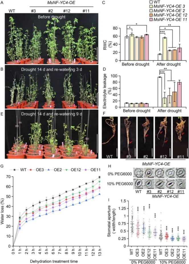 图4. 过表达MsNF-YC4增强紫花苜蓿的抗旱性。(A, B) MsNF-YC4-OE和WT植株在干旱胁迫前及胁迫处理后复水3天的表型。标尺=10 cm。(C, D) 干旱胁迫前后MsNF-YC4-OE和WT紫花苜蓿叶片的相对含水量(RWC)和电解质渗漏率(n=4)。,P < 0.05;,P < 0.01;,P < 0.001(单因素方差分析)。数值为平均值±标准差。(E) 干旱胁迫后复水9天,MsNF-YC4-OE和WT植株新长出的分枝。标尺=10 cm。(F) 复水9天后MsNF-YC4-OE和WT植株的根系表型。红色箭头指示新发育的根。标尺=5 cm。(G) WT和MsNF-YC4-OE植株离体叶片随时间变化的失水率(n=3)。,P < 0.05;**,P < 0.01(单因素方差分析)。数值为平均值±标准差。(H) MsNF-YC4-OE和WT植株在0%或15% PEG6000中暴露1小时后的气孔表型。标尺=10 µm。(I) WT和MsNF-YC4-OE植株在0%或15% PEG6000中处理1小时后的气孔开度(n=60)。,P < 0.05;***,P < 0.001(单因素方差分析)。数值为平均值±标准差。
