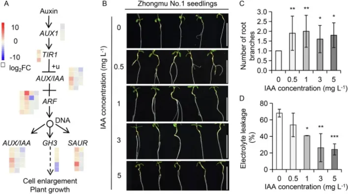 图5. MsNF-YC4-OE根系的转录组分析。(A) 分配至生长素信号转导通路的差异表达基因的热图。颜色强度代表log2FC(倍数变化对数值)。(B, C) 经外源IAA处理的幼苗的植株表型和根分枝数。,P < 0.05;**,P < 0.01(单因素方差分析)。数值为平均值±标准差(n=10)。标尺=3 cm。(D) 在五种浓度的IAA中培养9天后,再用10% PEG6000处理6天的幼苗的电解质渗漏率。星号表示经单因素方差分析确定的显著性差异(, P < 0.05; ***, P < 0.001)。数值为平均值±标准差(n=10)。