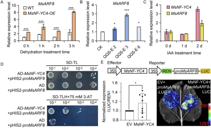 图6. MsNF-YC4上调MsARF8的转录。(A) 脱水处理下WT和MsNF-YC4-OE根中MsARF8的相对表达水平(n=3)。数值为平均值±标准差。,P < 0.001(单因素方差分析)。(B) CK和QQS-E根中MsARF8的相对表达水平(n=3)。数值为平均值±标准差(n=3)。,P < 0.05;,P < 0.001(单因素方差分析)。(C) 经1 mg L⁻¹ IAA处理的紫花苜蓿幼苗根颈部MsNF-YC4和MsARF8的表达模式。数值为平均值±标准差。(D) 酵母单杂交(Y1H)分析显示MsNF-YC4与MsARF8启动子的结合。SD-TL:SD/-Trp-Leu培养基;SD-TLH + 75 mmol L⁻¹ 3-AT:含75 mmol L⁻¹ 3-AT的SD-TLH培养基。图像于30°C孵育3天后拍摄。(E) 在共转化了MsNF-YC4效应子构建的烟草叶片中,对proMsARF8-LUC报告基因的瞬时激活分析(n=10)。LUC:荧光素酶。,P < 0.05(学生t检验)。