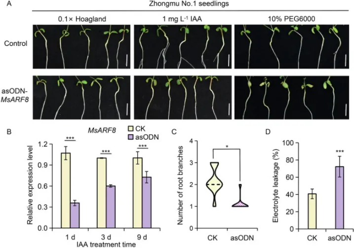 验证了关键下游基因的功能: 通过反义寡核苷酸(asODN)技术对MsARF8进行瞬时抑制,实验有力地证明了MsARF8是生长素诱导的根系分枝和抗旱性的正向调控因子(Fig. 7)。这不仅为整个调控通路提供了功能性闭环证据,也凸显了MsARF8作为一个潜在的育种改良靶点的重要性。