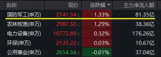 重挫之后,军工快速反击,重返行业涨幅榜榜首!主力闻风而动,大举回流,全天净买入国防军工行业超81亿元。
