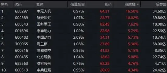航空航天、地面兵装、航海装备相关成份股涨幅居前,中无人机盘中飙逾18%创历史新高,航天彩虹涨停3天2板,国科军工涨7.62%,宗申动力、中国动力、海兰信等多股涨超5%。