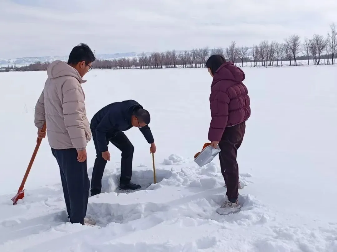 为深入践行雷锋精神,切实保障冬小麦安全越冬、筑牢夏粮丰收基础。3月3日至5日,裕民县农业农村局结合本年度部分冬小麦播种地块未浇灌播前水的实际情况,组织农技人员深入田间地头,开展冬小麦安全越冬雪下专项勘查志愿服务活动。此次勘查重点监测田间积雪厚度及压实程度、麦苗存活状态与分蘖长势、土壤墒情变化以及雪腐病、雪霉病等越冬病虫害发生情况,以精准勘查护航春耕生产。