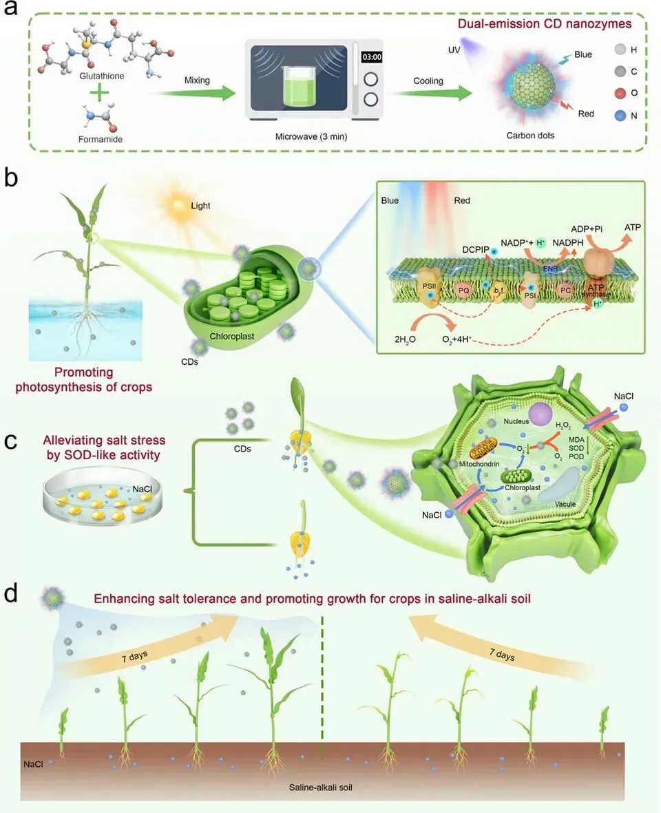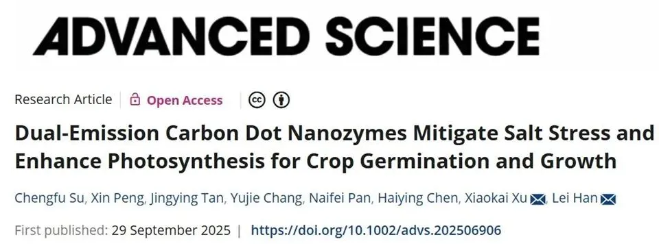 近日,青岛农业大学农学院博导韩磊教授团队在盐碱地作物抗逆与生长促进研究方面取得新进展,通过合成一种新型碳点纳米酶,在不依赖基因改造和有机农药的前提下,直接提升作物耐盐碱性。相关研究成果发表在《Advanced Science》期刊上。该论文以青岛农业大学农学院为第一通讯单位,农学院教师苏成付副教授、农学院硕士研究生彭欣、化药学院硕士研究生谭婧盈为共同第一作者,农学院博士生导师、化药学院生物纳米与分子识别团队及国创中心纳米农业工程团队负责人韩磊教授为第一通讯作者,团队许晓凯教授为共同通讯作者。