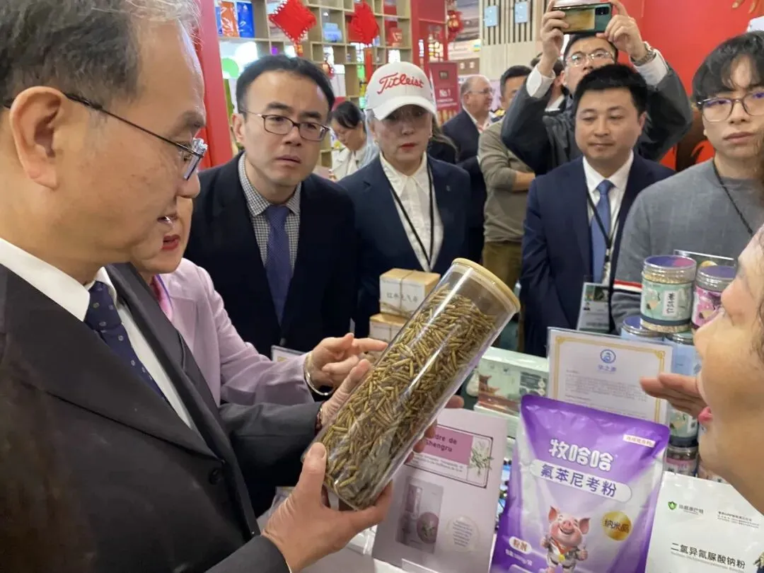 河南农业大学科技代表团向邓励大使介绍全球领先的黑水虻生物转化项目。