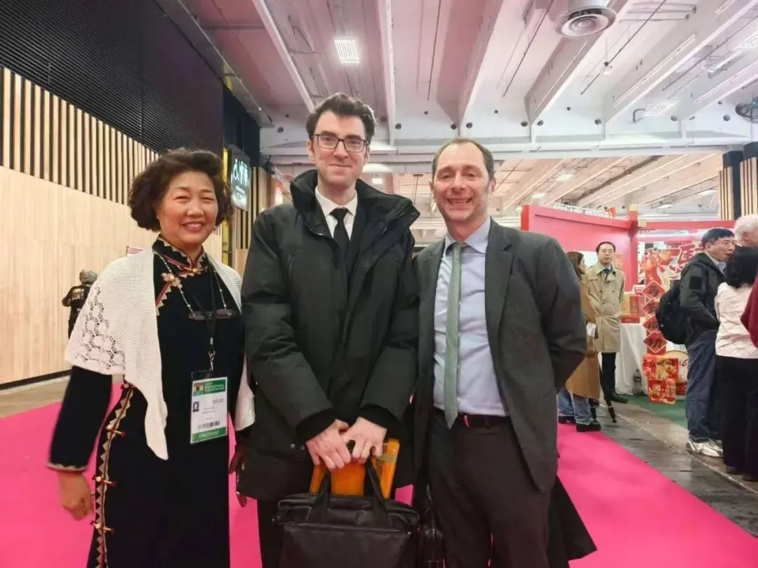 法国驻华农业参赞马克斯·莫诺( Max MONOT)(中)、塞德里克·普雷沃(Cédric PRÉVOST)(右)参观中国农业展台。