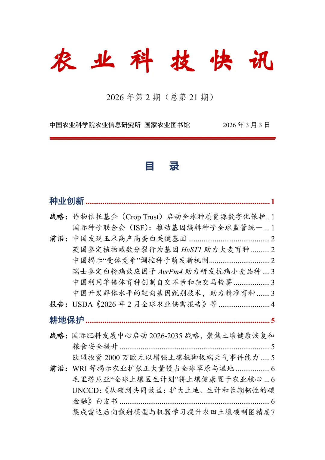《农业科技快讯》依托中国农业科学院农业信息研究所及国家农业图书馆的情报分析力量,聚焦种业创新、耕地保护、人工智能+农业、生物安全、绿色低碳、乡村发展、食品科技七个农业重点领域,设置战略规划、前沿动向和报告概况三个栏目,追踪最新进展和动态,致力于提供更新、更全、更有价值的农业领域信息资讯!