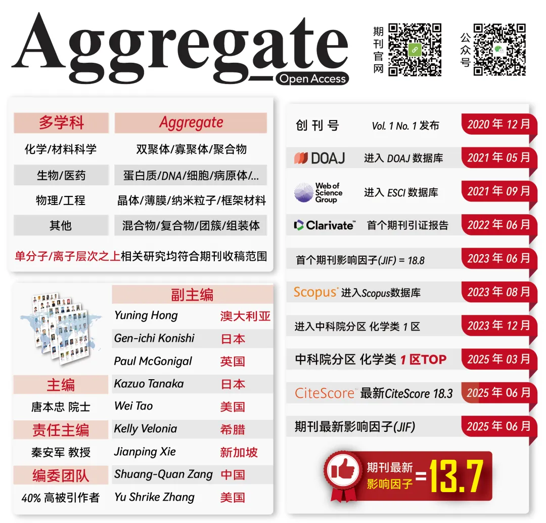 Aggregate 在科睿唯安发布的期刊引证报告(JCR)中,连续四年位列“化学:综合”,“物质化学”和“材料科学:综合”三个学科Q1区,期刊最新影响因子为13.7;在2025年中国科学院文献情报中心期刊分区表中,位列化学大类一区TOP,并进入三个小类一区!